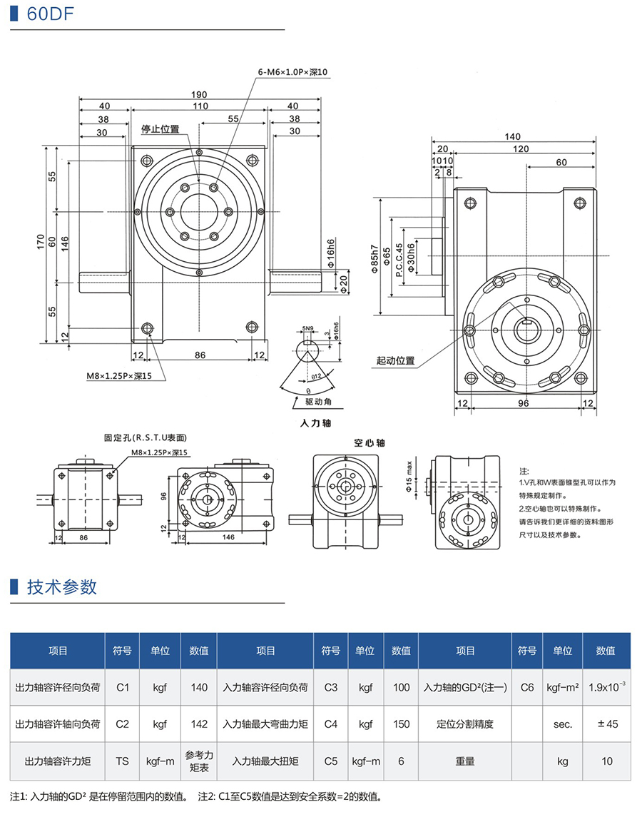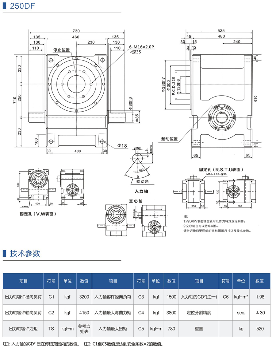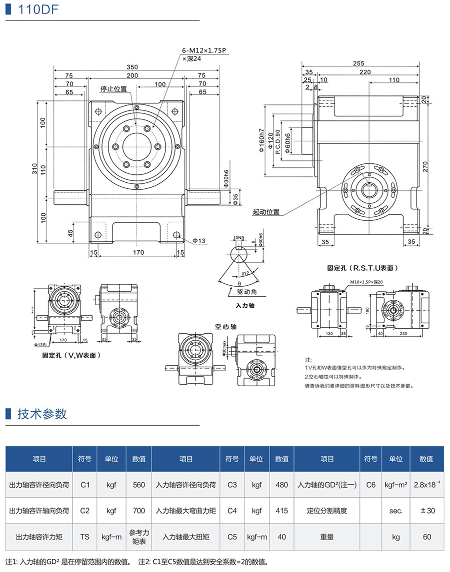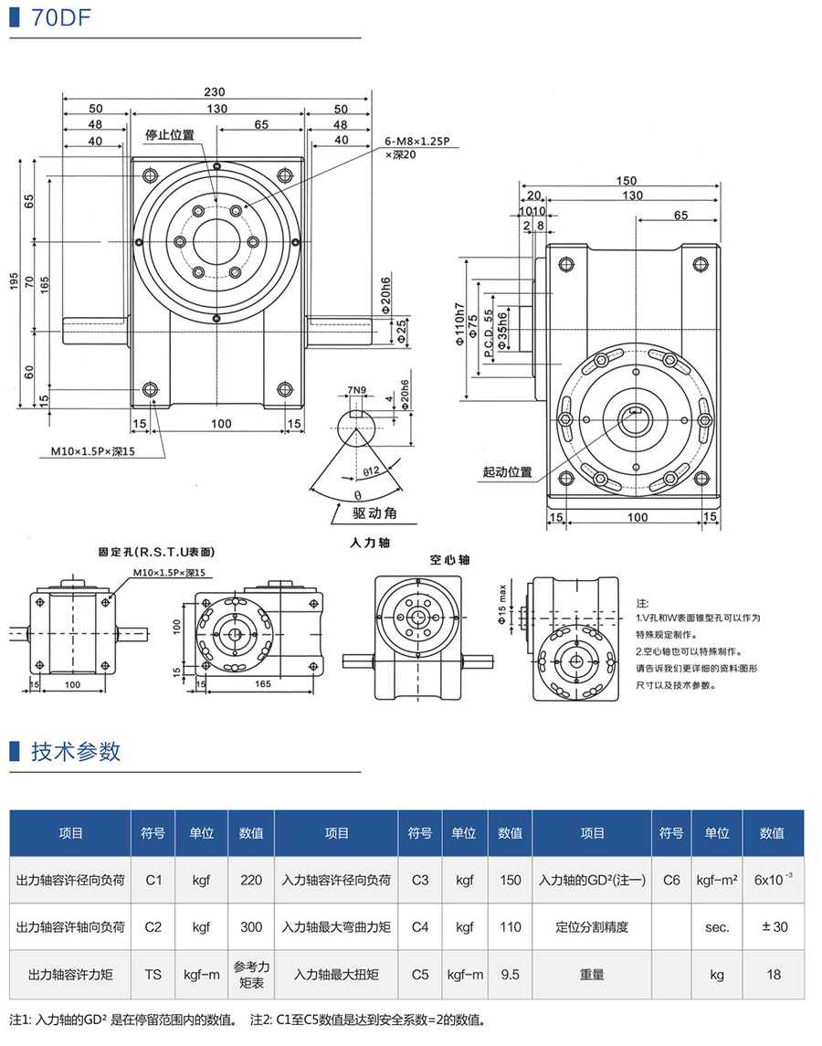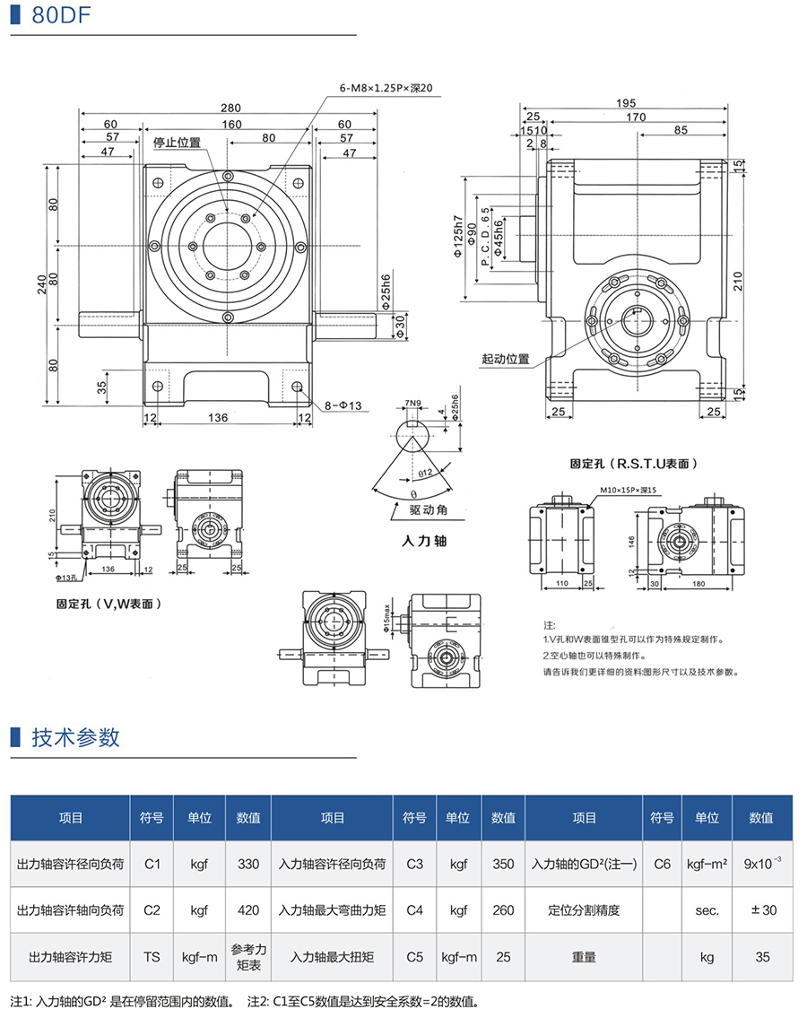 此机种具有重负荷特性,可承受较大的垂直径向或轴向压力,其输出轴为法兰盘式设计,有凸缘中心、盘面螺孔、定位、销孔、固定面宽大,可使链接件更具坚实平稳。最能适用于较大负荷的回转式圆盘驱动场合,被广泛使用在各类盘式加工机械及类似机构的产业机械;自动化间歇驱动部,驱动圆盘。